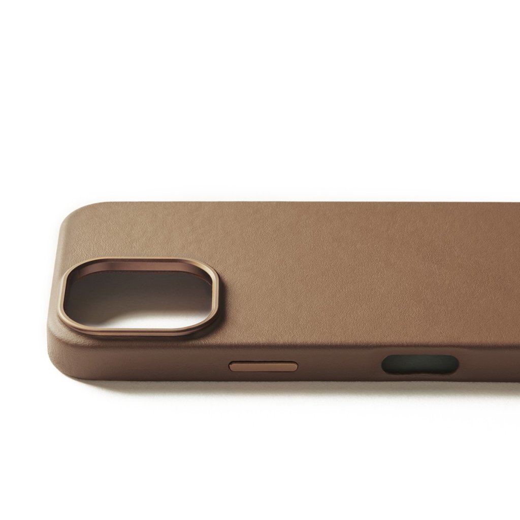 En maskinbearbejdet kamerabump af genbrugsaluminium beskytter de bageste kameralinser. Dette smukt designede stykke hardware beskytter kameraet og forbedrer etuiets samlede holdbarhed. Aluminium giver robust beskyttelse, mens læder kan være modtageligt for skader fra stød og ridser.