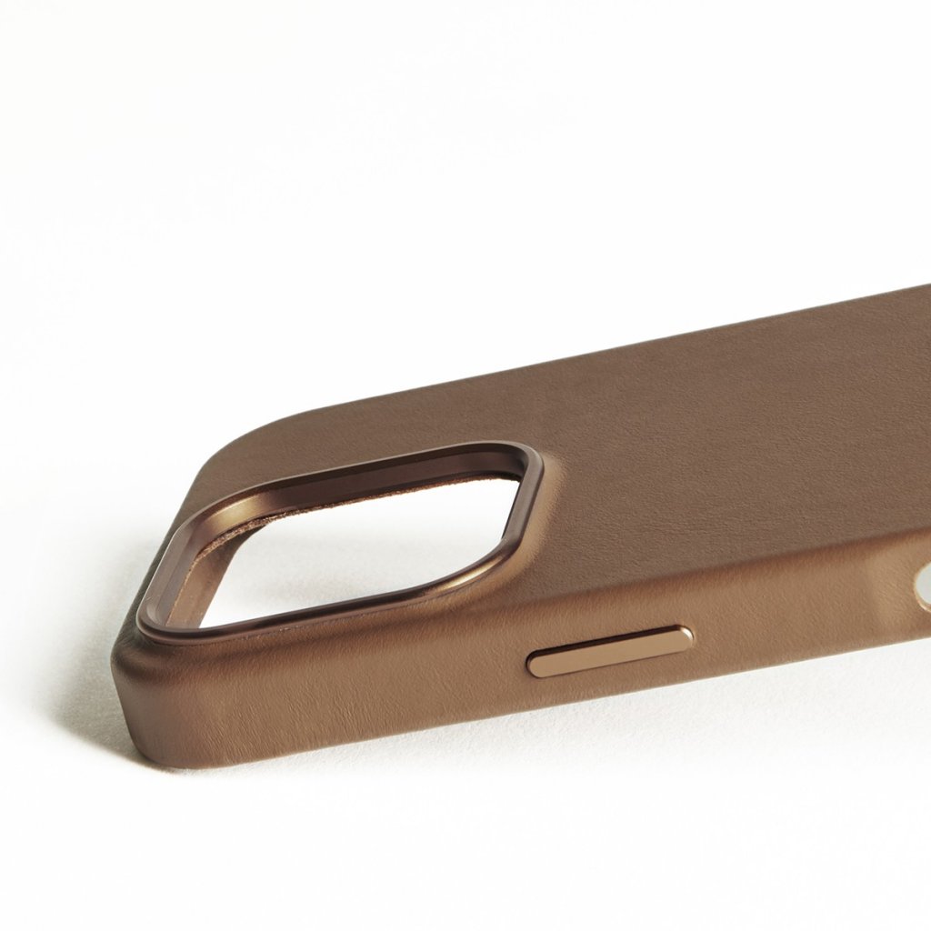 Sideknapperne er omhyggeligt udformet af bearbejdet metal for at give optimal reaktionsevne. De giver et supertilfredsstillende klik og er indfarvet, så de matcher det rige tan-læder. Denne opmærksomhed på detaljer er i tråd med vores minimalistiske designfilosofi. Etuier til iPhone 16 Pro-modellerne kommer med en lydløs knap og en volumenknap i ét stykke for forbedret funktionalitet.