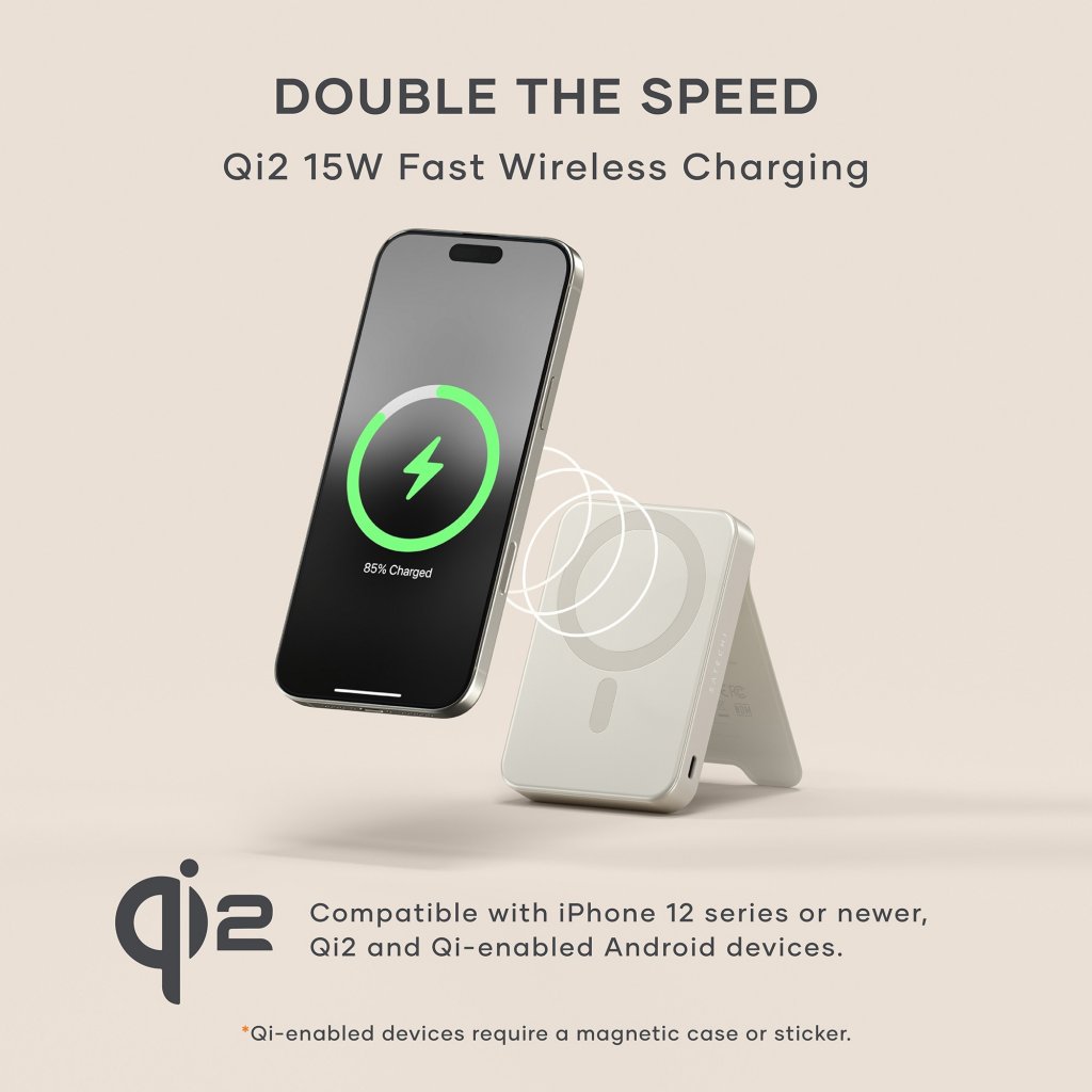 Unleash the power of magnetic wireless charging with the Satechi OntheGo™ Qi2 10K Magnetic Power Bank with Stand. This versatile power bank combines the convenience of magnetic attachment with fast wireless charging, ensuring your devices stay powered up wherever you go. With its sleek sand colored design and built-in stand functionality, it's the ultimate charging companion for your modern lifestyle.