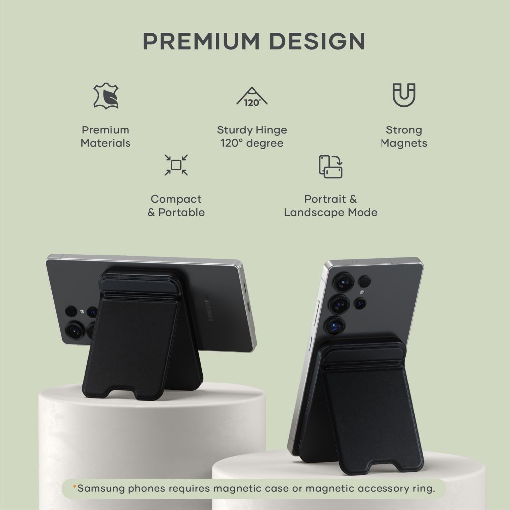 - Premium portable 5,000mAh power bank with built-in adjustable stand
