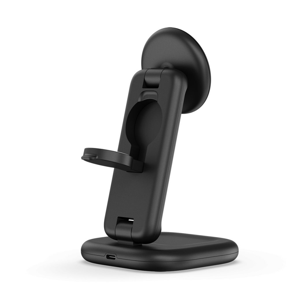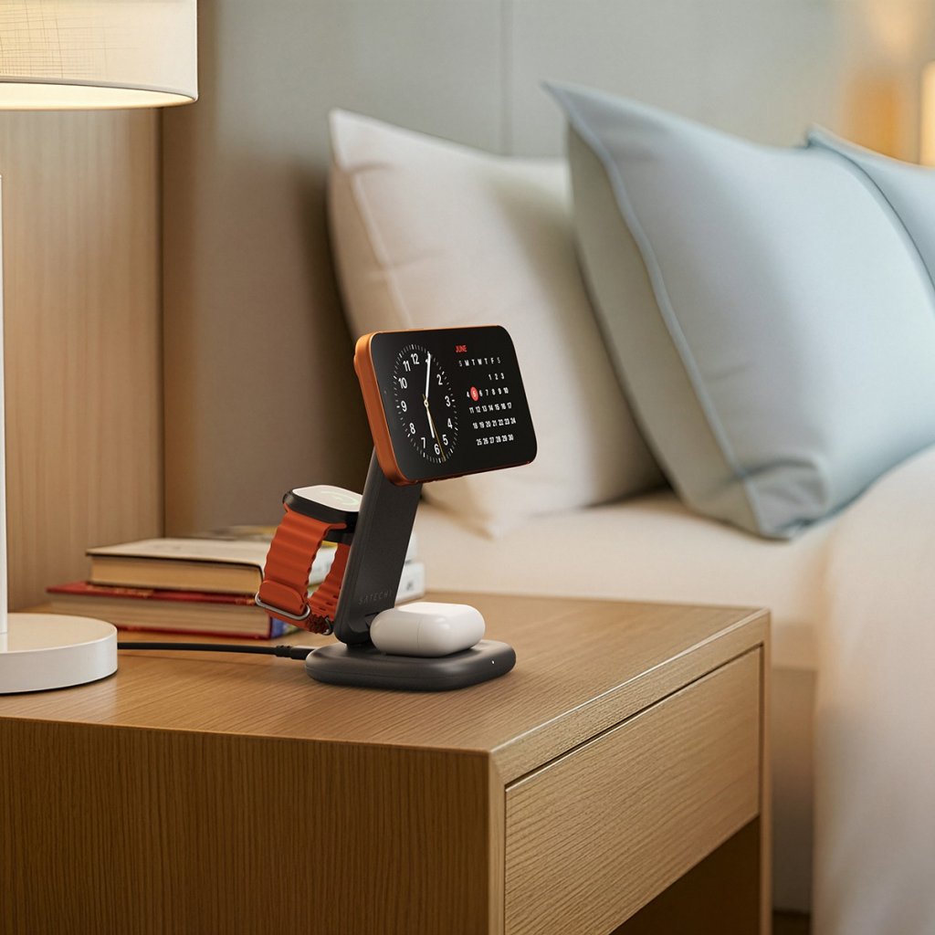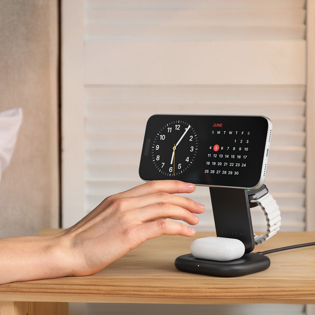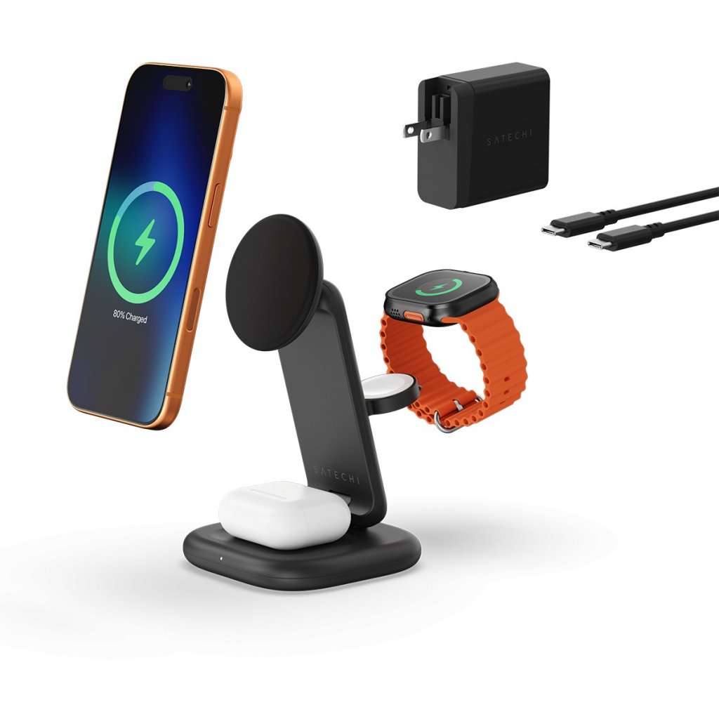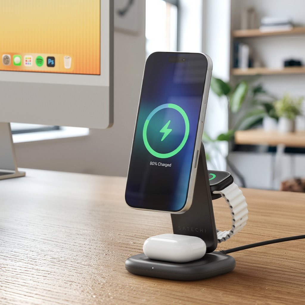 Pidä iPhone, Apple Watch ja nappikuulokkeet ladattuina ja käyttövalmiina yhdellä kompaktilla telineellä. Satechi 3-in-1 Foldable Wireless Charging Stand yhdistää nopean Qi2-langattoman latauksen, matkalle sopivan taitettavan rakenteen ja kaiken tarvittavan, jotta voit ladata kotona, toimistolla tai liikkeellä ollessasi.