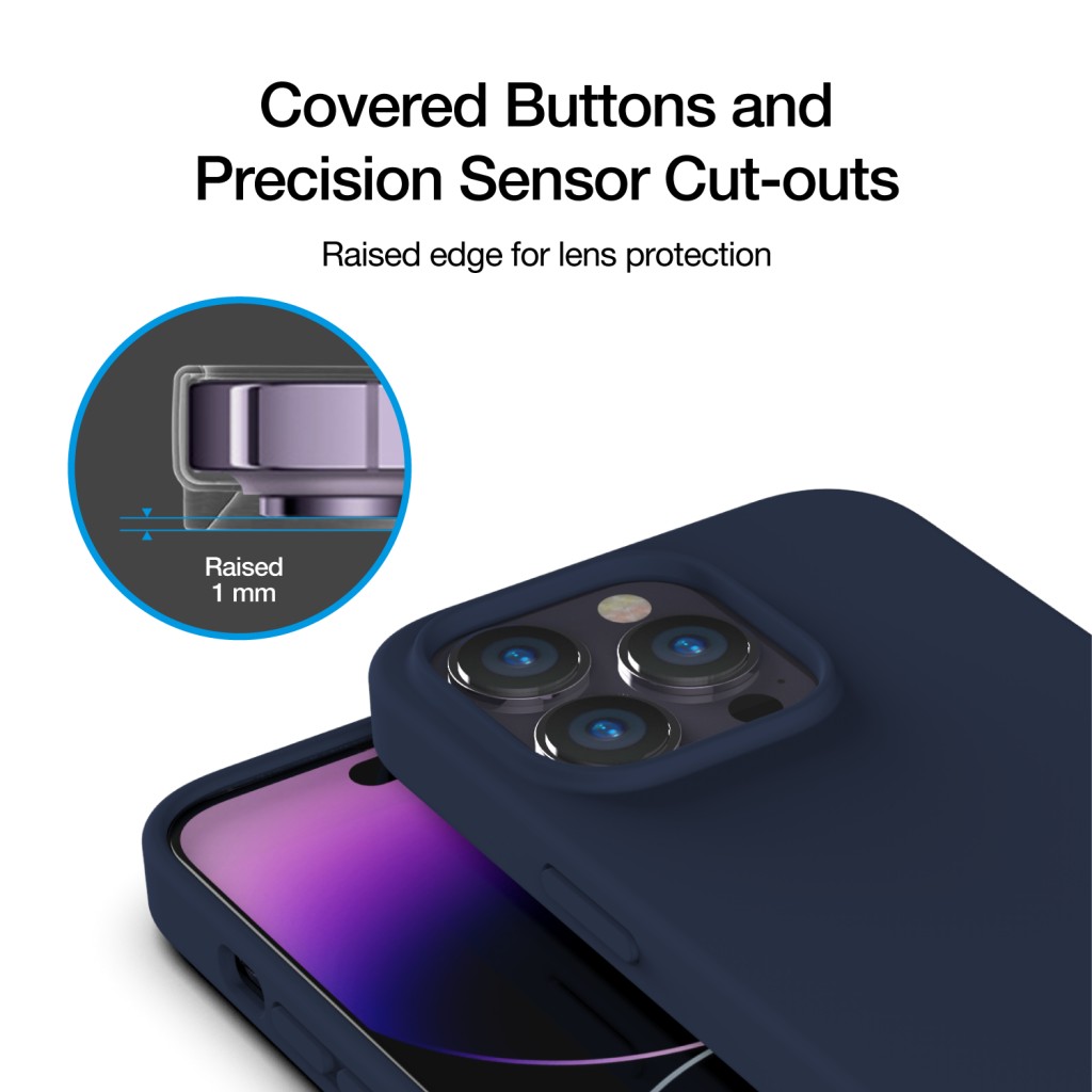 En 1 mm upphöjd kant omsluter skärmen och kameran för extra trygghet på plana ytor. De täckta knapparna har djupa utskärningar för att bevara den ursprungliga klickkänslan, medan exakta öppningar håller portar och högtalare fria.