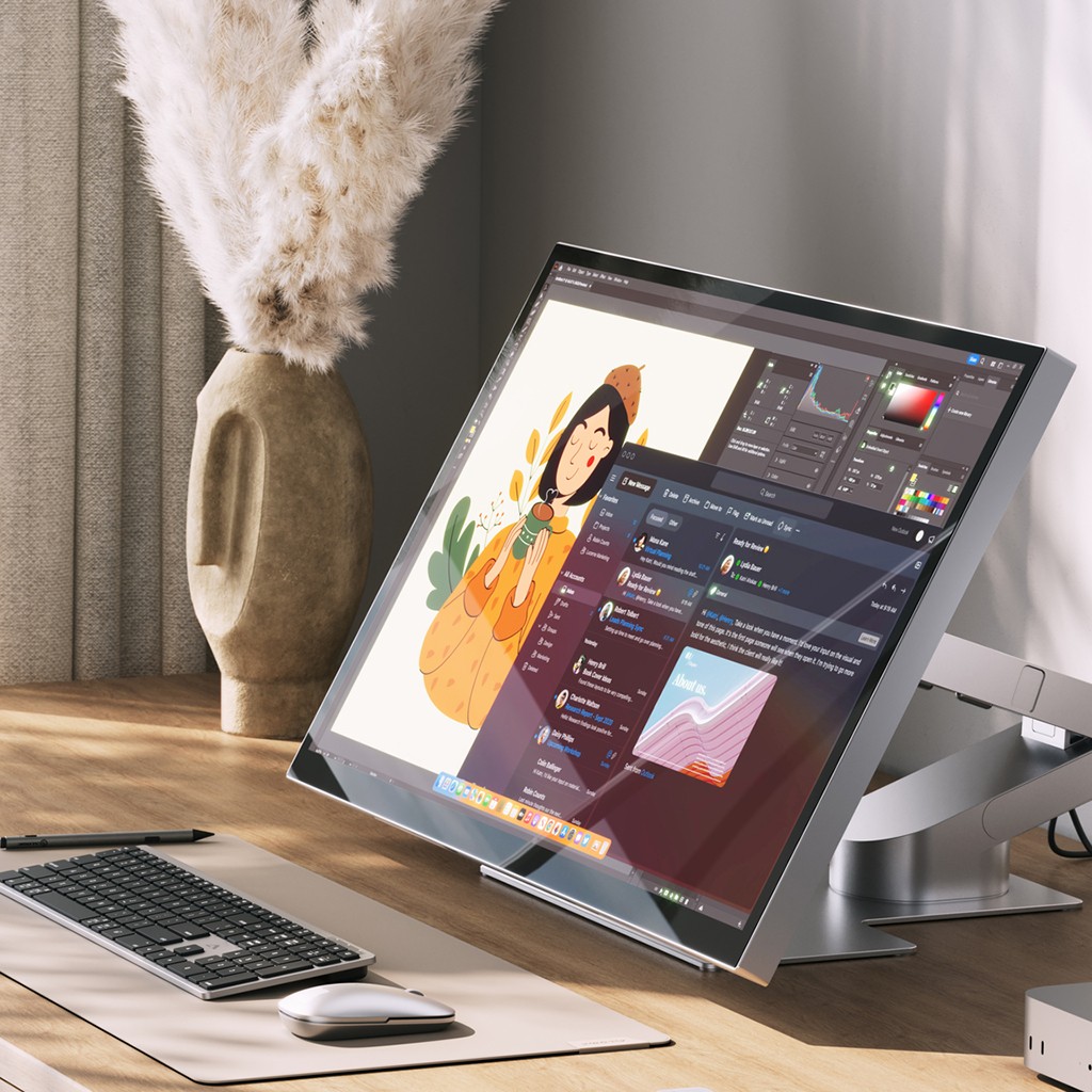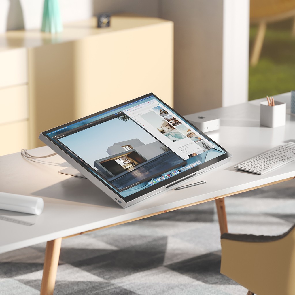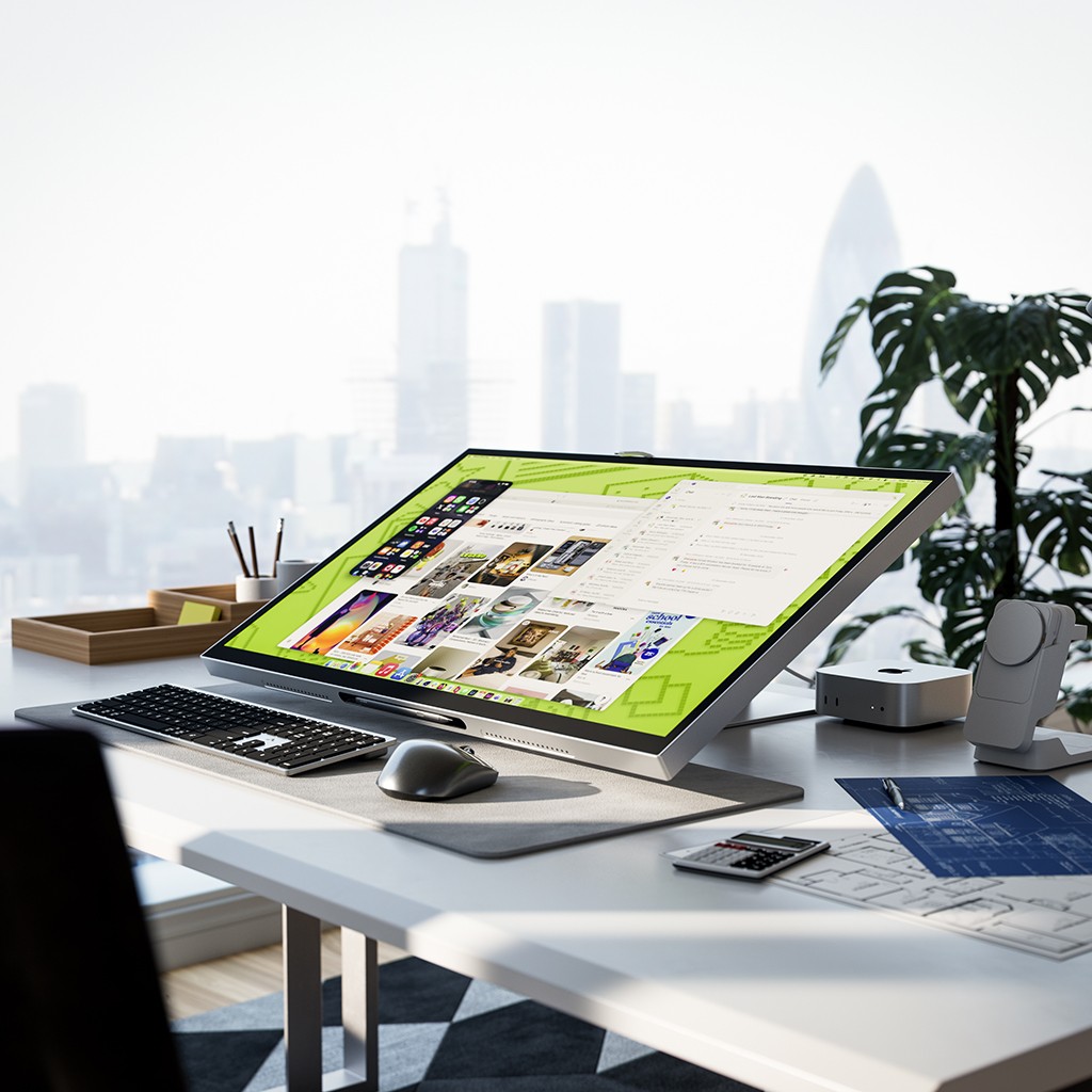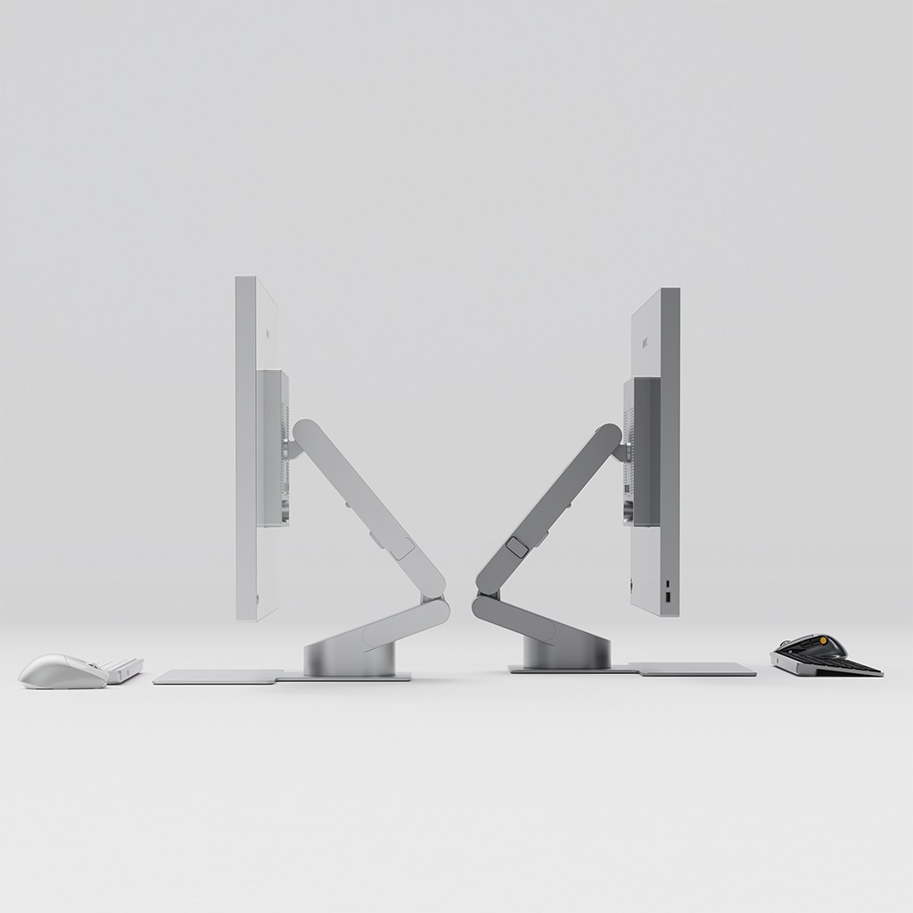 Stativet är utformat för att du snabbt ska kunna anpassa din uppställning efter uppgiften. Ha skärmen upprätt för vardaglig produktivitet och fäll sedan ned den när du vill arbeta lägre och mer hands-on, utan verktyg eller en krånglig justeringsprocess.