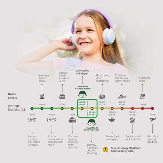 • Dobbelt volumkontroll med 85 dB Safe Mode og 94 dB Travel Mode