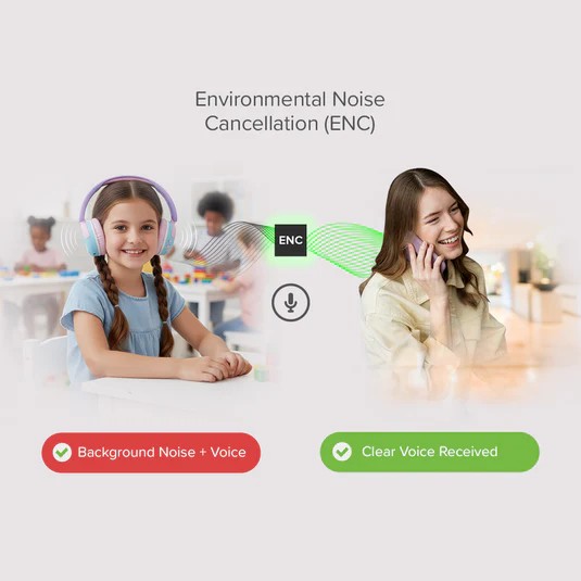 Innebygd Environmental Noise Cancellation bidrar til å redusere forstyrrende bakgrunnsstøy, slik at barnet både hører klarere og blir hørt tydeligere i samtaler, selv på steder med mer støy.