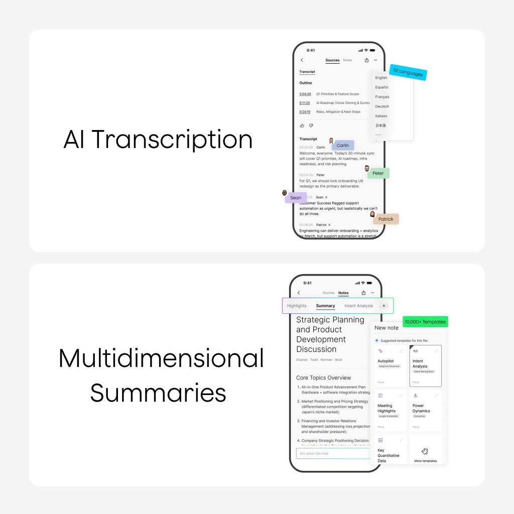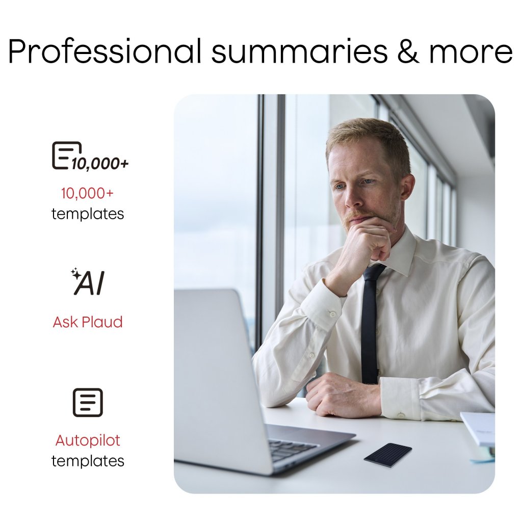 Plaud Note omvandlar inspelningar till användbar kunskap med automatisk språkidentifiering, talaretiketter och stöd för anpassad vokabulär (ordlista) för förbättrad noggrannhet. AI-genererade sammanfattningar och strukturerade anteckningar lyfter fram viktiga punkter och åtgärder med hjälp av 10 000+ AI-drivna mallar för olika branscher. Markera viktiga ögonblick, lägg till skrivna anteckningar eller bilder och använd Ask PLAUD för att direkt söka i transkriptioner och sammanfattningar utan att spela upp inspelningarna igen.