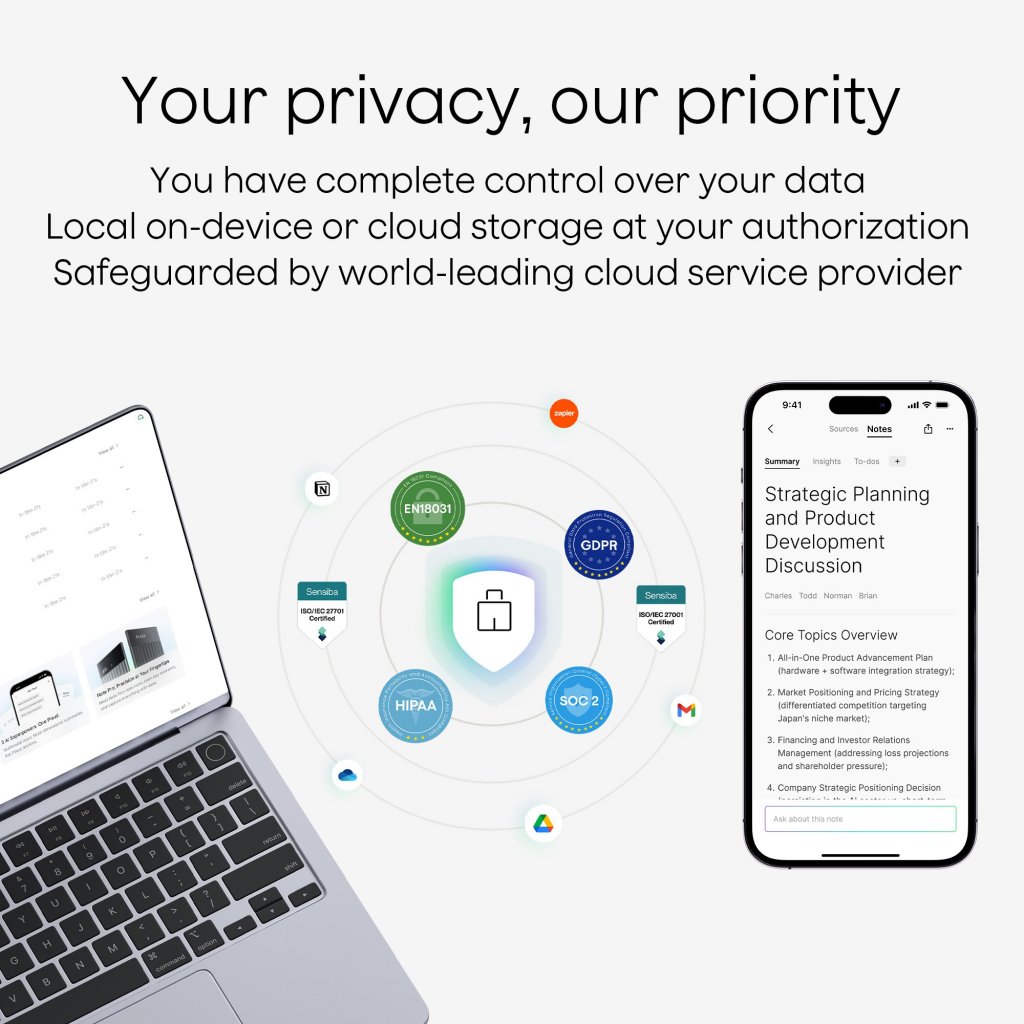 Plaud Note integreras sömlöst med apparna Plaud för mobil, webb och Desktop och samlar inspelningar, transkriptioner, sammanfattningar och AI-insikter i en gemensam arbetsyta. Med apparna kan du granska, söka, markera och ställa frågor om innehåll med Ask PLAUD, medan appen PLAUD Desktop kan spela in onlinemöten direkt från plattformar som Google Meet, Zoom och Teams — så att fysiska och virtuella samtal hålls organiserade på ett och samma ställe
