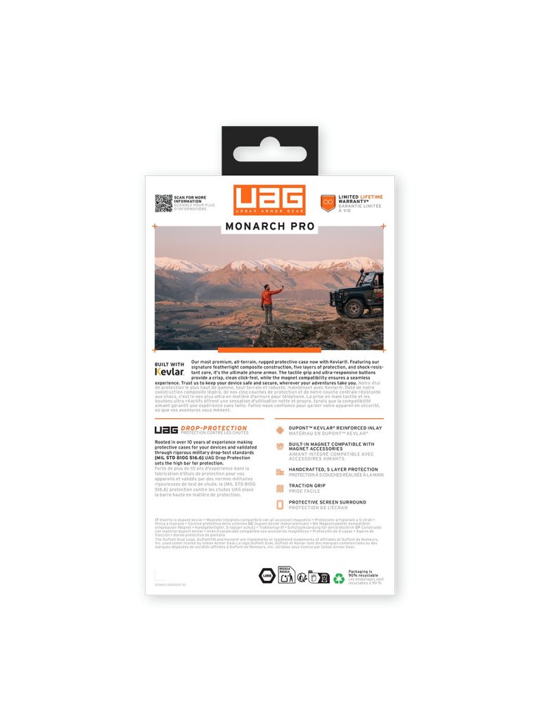 Monarch Pro har en innovativ 5-lagers konstruktion, inklusive en stöttålig kärna, signaturpansarram med Kevlar®-inlägg, polykarbonatplatta, slagtålig gummiomfattning och en integrerad magnetmodul. Denna omfattande design säkerställer att din enhet förblir säker från fall, repor och dagligt slitage.